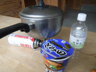 休憩所に誰もいなかったので中で朝食です。今回はチリトマトでなく松戸のラーメン屋のカップヌードルです。