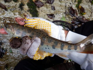 その最初のポイントで。釣れました。32㎝のオスイワナです。ミミズを入れるなりいきなり喰ってきました。久しぶりの感触です。