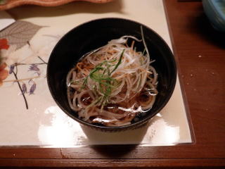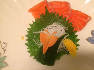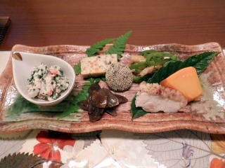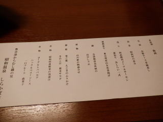 そして夕食。この料理が素晴らしいです。献立表もついています。ひとつひとつ解説できないのが残念です。メープルサーモンという刺身のつまの上に「にんじんのちょうちょ」が留まっていました。