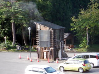 しらかば荘の駐車場には温泉を冷ます小屋があります。湯気が上がっていました。