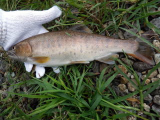1カ所目、昨日木っ端がたくさんいた流れ込み(魚が小さいのでハリがかりせず、ミミズをくわえてひっぱって行ったところでハリが草に絡まり、仕掛けを4セット無駄にした)ですが、今日はいません。もしかしたら、誰か朝のうちにはいったのかも。