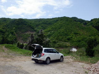 車中泊した場所の対岸近くの広場でゆっくり約1時間荷物の整理。(半袖をもって来なかったのは大失敗)