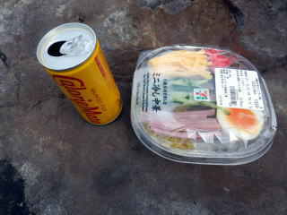 途中の空き地で昼食。メニューはセブンの冷やし中華ミニとカロリーメイトです。