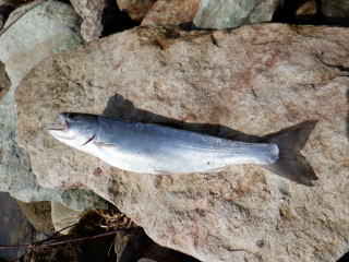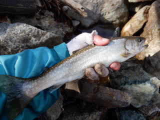7時半頃にぶっ込みの竿にきた27㎝の銀毛ヤマメ?(サクラマスと呼ぶには小さい。もしかしてヒメマス?)1尾のみ