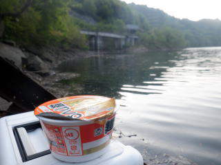 ここで朝食,お湯を湧かしてつくるカップの味噌ラーメンです。ちょっと麵が固いままでした。