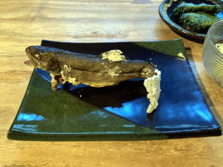 夕飯は炭火焼きのイワナとそばが美味しかったです。