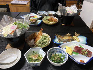今回は、馬刺しのほか、卵をたくさん持ったアユの塩焼き、フキノトウの天ぷら、アサツキとカンゾウの和え物など豪華です。