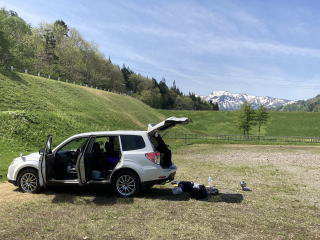 車中泊した場所に戻り片付けと昼飯です。