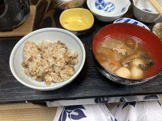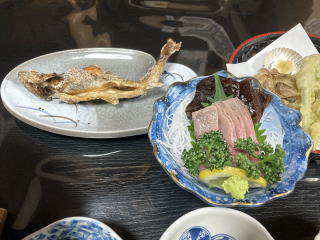 イワナの刺身を久しぶりに味わいました。おいしいです。そのほかにもたくさんの山菜が使われた料理、マイタケご飯、裁ちそばなど