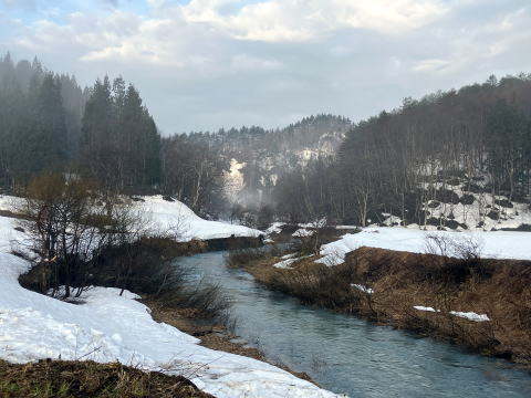 この時期は雪代で水量が多く、本流筋では釣りにならないのですが、川を覗くと、今年の大雪のせいか青みがかった雪代は想像以上です。
